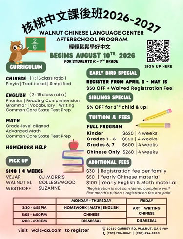 Since our establishment in 2004 as a registered heritage school and a member of Southern California Council of Chinese Schools, the Walnut Chinese Language Center has been providing families of the local communities with programs encouraging academic excellence and bilingualism.